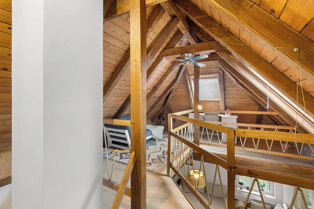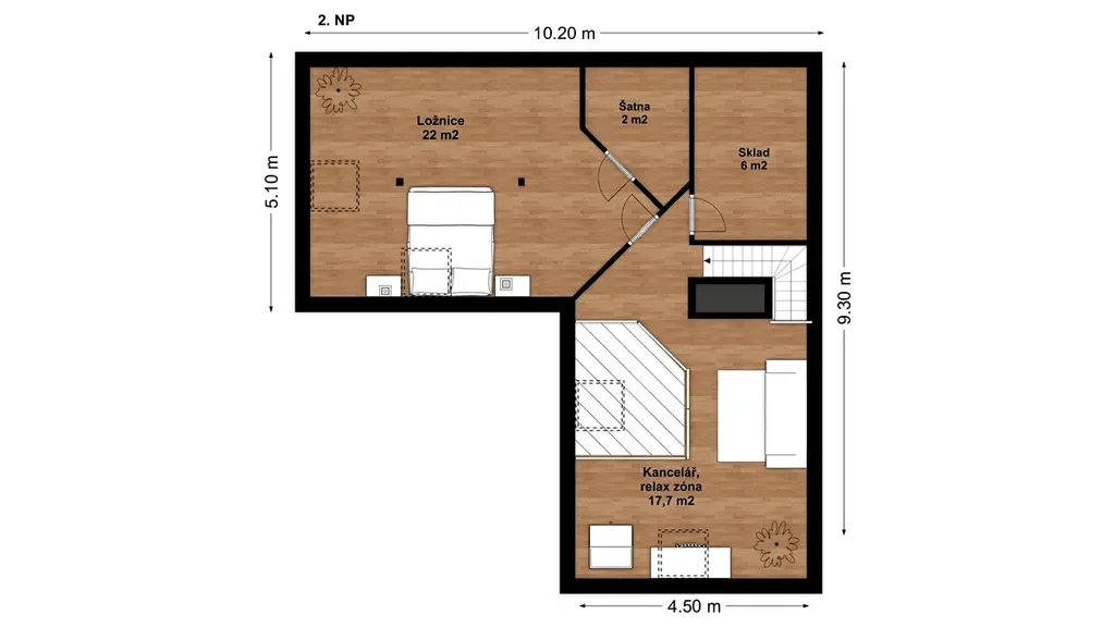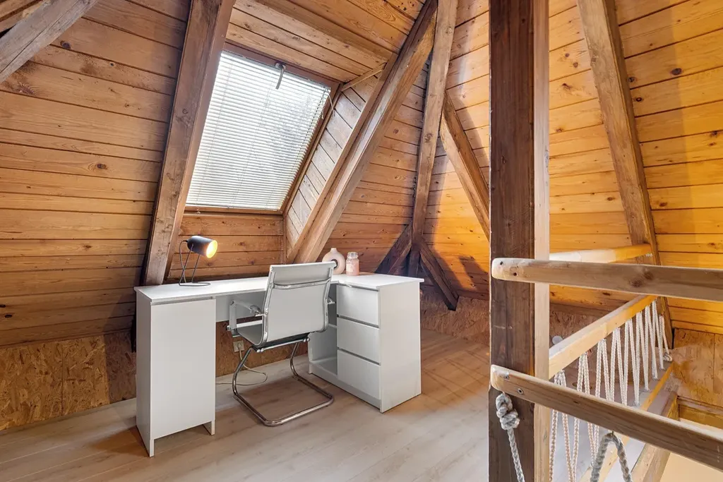 Schodiště kolem krbu vás zavede do podkroví, kde se při vstupu otevírá dřevěný prostor vhodný jako pracovna, relaxační zóna nebo místo pro klidné posezení. Navazuje na něj samostatný prostorný pokoj s menší šatnou a dalším praktickým úložným prostorem.