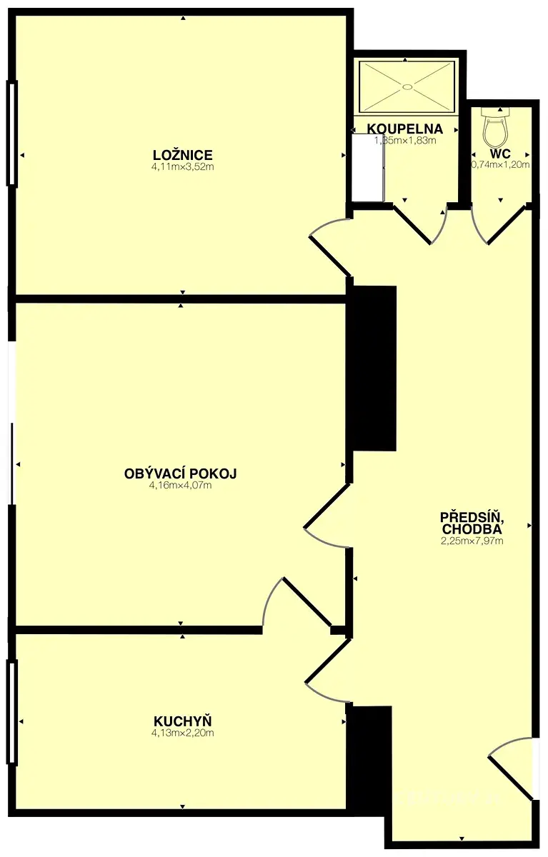 Obývák zdobí francouzské okno – ideální na to, abyste ráno mohli dramaticky roztáhnout závěsy a cítit se jako ve filmu. Kuchyň je připravena k instalaci vlastní linky, takže si můžete splnit sen o kuchyni, ve které budete vařit… nebo si aspoň budete dělat kafe s větším stylem.