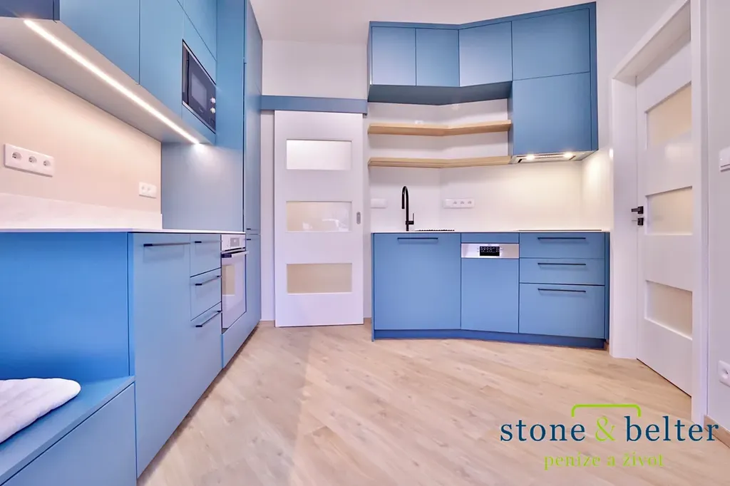 • Nová kuchyň vybavená spotřebiči: vestavná lednice s mrazákem, indukční deska, trouba, mikrovlnná trouba, digestoř a myčka.