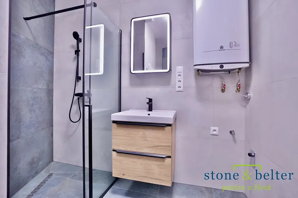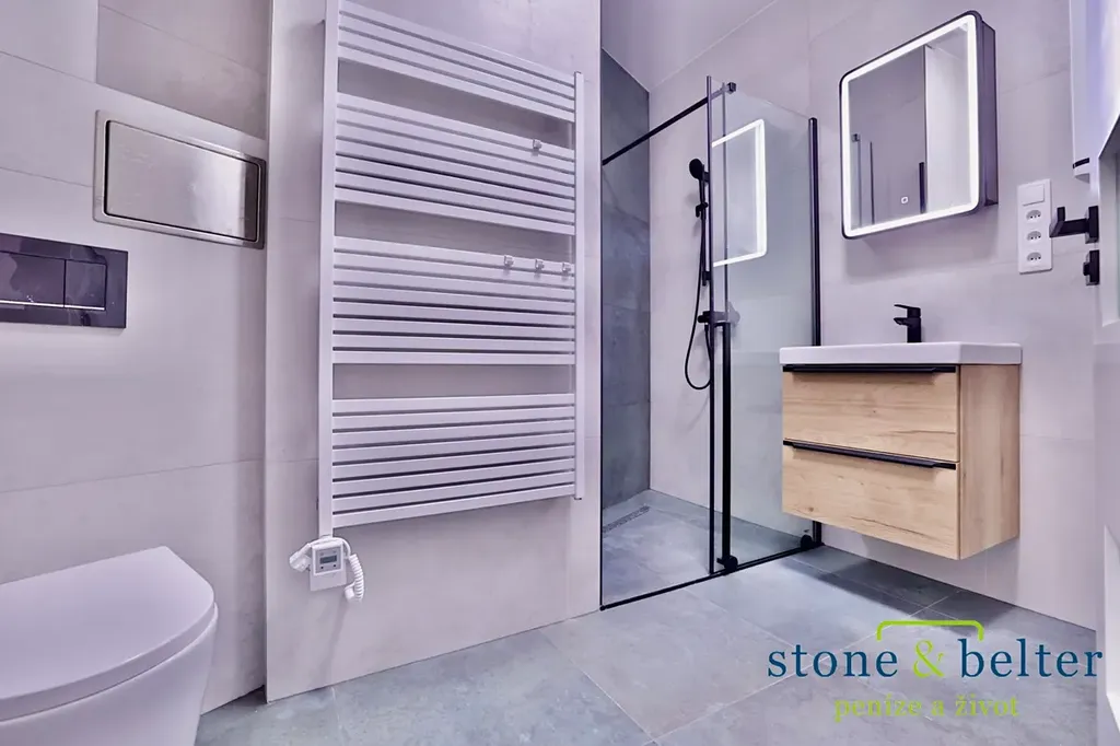 • Vkusně zařízená koupelna se sprchovým koutem, toaletou, vlastním umyvadlem a elektrickým topením.