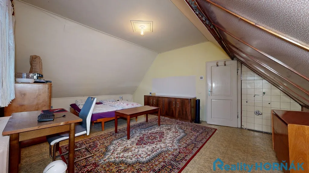 Podkroví domu tvoří půdní vestavba se dvěma pokoji a samostatným nevyužívaným půdním prostorem. Dispozičně zahrnuje dvě ložnice (5,48 m x 3,81 m = 20,9 m² a 3,40 m x 3,71 m = 12,7 m²), chodbu (2,00 m x 3,55 m = 7,1 m²) a půdu – nevyužívaný prostor (5,48 m x 4,37 m = 23,9 m²). Celková orientační plocha podkroví činí přibližně 64,6 m², z toho plocha pokojů a chodby přibližně 41 m² a samostatný půdní prostor 23,9 m². Případné další obytné využití půdy bude vyžadovat stavebně-technické posouzení. Součástí domu je sklepní prostor (25,2 m2) tvořený jednou místností.