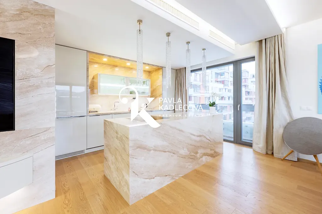 Dominantou bytu je otevřený obytný prostor s kuchyní, jídelnou a obývací částí, který je díky celoproskleným plochám zaplaven denním světlem a přirozeně se propojuje s terasami o celkové ploše 32 m². Kuchyň obložená mramorem je vybavena spotřebiči Miele, včetně vinotéky a plynule navazuje na designový/zakázkový jídelní stůl. Atmosféru prostoru dotváří podsvícená onyxová stěna s integrovaným parním krbem a promyšlené ambientní osvětlení. Celý obytný prostor je ideální jak pro každodenní rodinný život, tak pro společenská setkání.