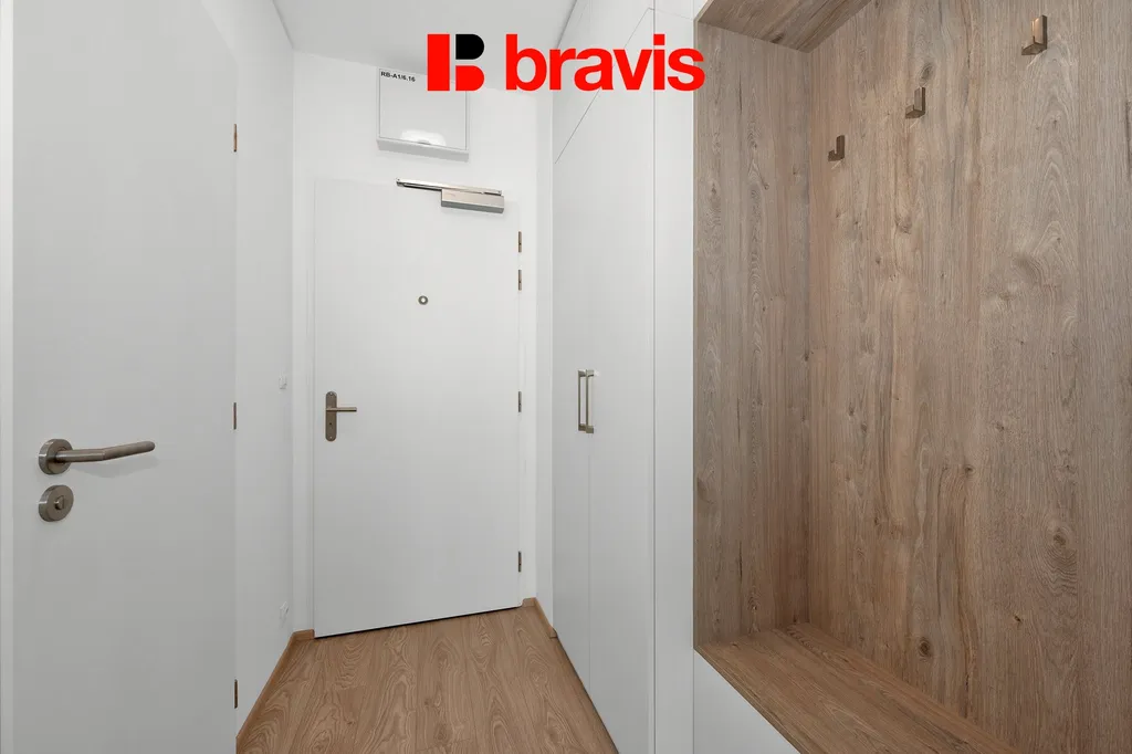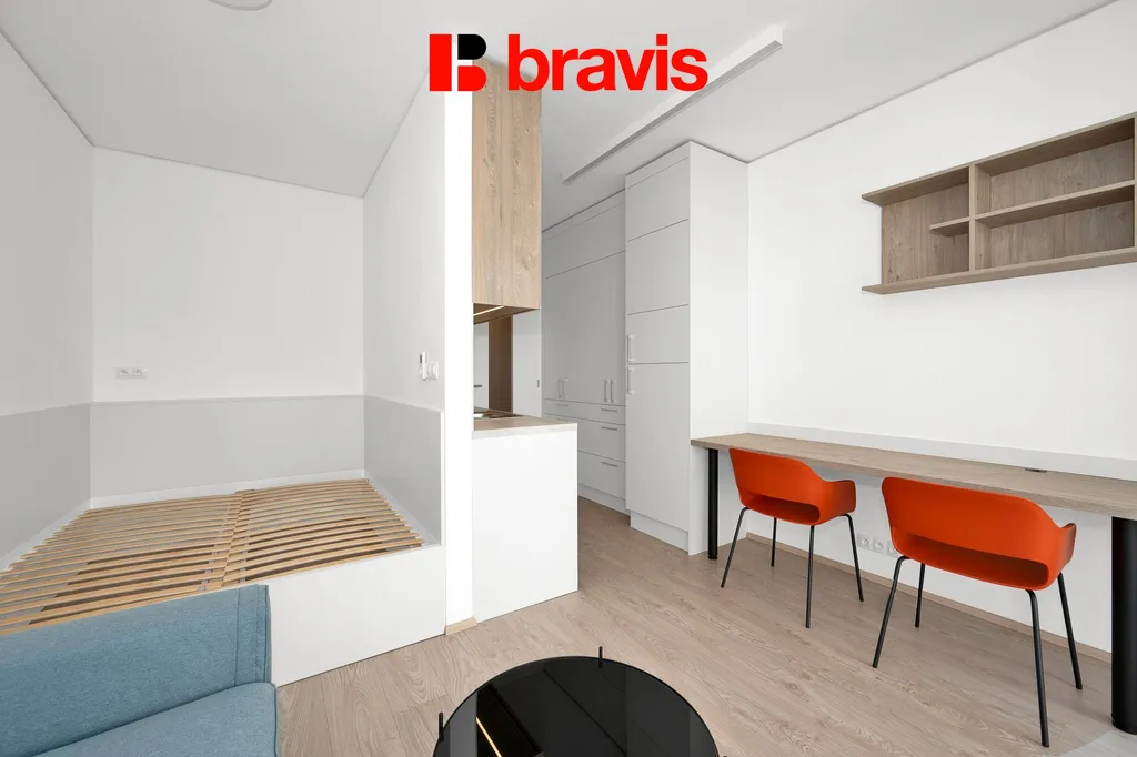 Byt, nacházející se v 6. nadzemním podlaží, je nabízen plně zařízený s důrazem na praktičnost a funkčnost. Moderní kuchyň je vybavena všemi potřebnými spotřebiči včetně lednice, trouby, indukční varné desky, digestoře, mikrovlnné trouby, myčky a pračky se sušičkou. V obývacím prostoru najdete sedací soupravu s konferenčním stolkem a psacím stolem. V předsíni jsou vestavěné skříně. Pokoj dále nabízí spací niku s manželskou postelí.