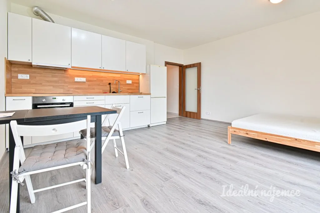 Byt se nabízí vybavený. Kuchyňská linka disponuje troubou, indukční deskou s digestoří a lednicí. Toaleta je součástí koupelny, k dispozici je pračka umístěna rovněž v koupelně. Z pokoje je východ na předzahrádku.