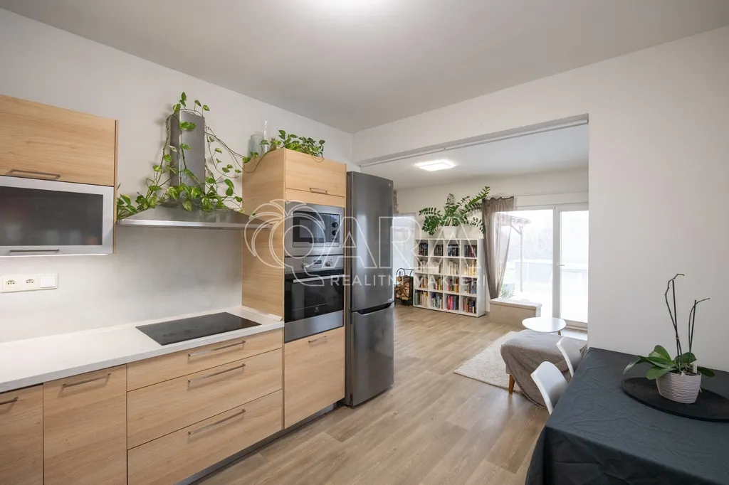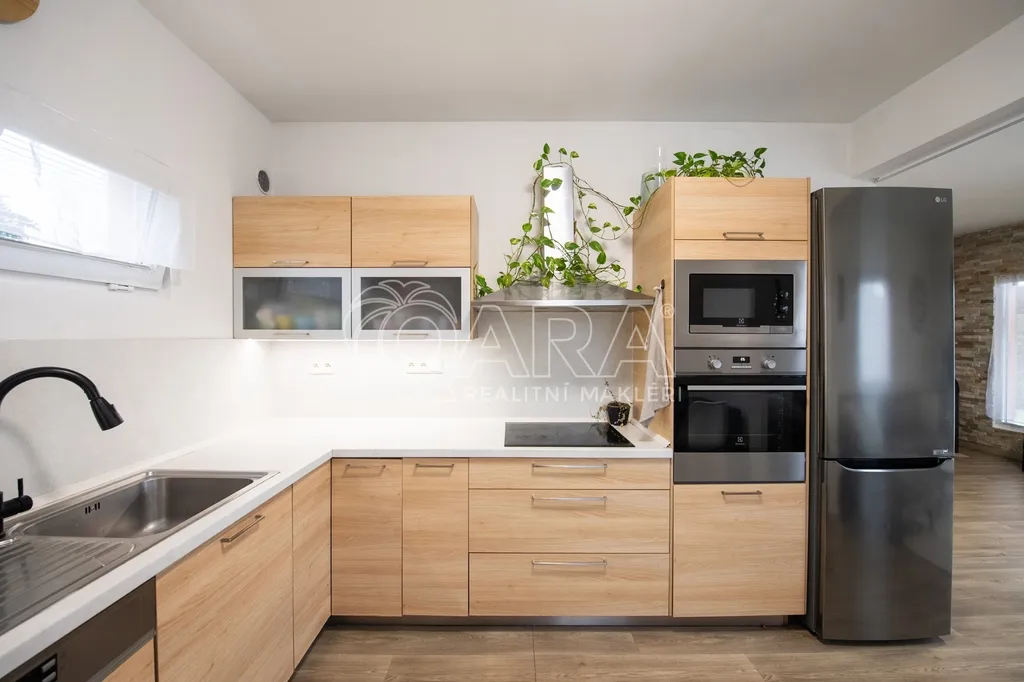 V kuchyňi je komplet vybavená linka včetně spotřebičů: myčka nádobí, el. trouba, varná deska (indukce), mikrovlnka, digestoř, lednice s mrazákem.