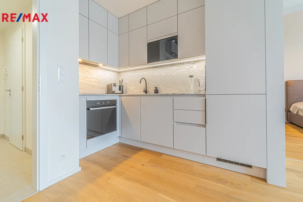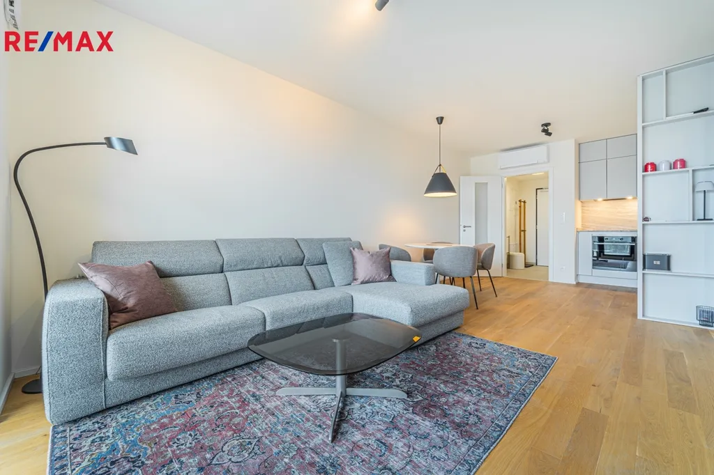 Byt nabízí prostorný obývací pokoj pravidelného tvaru s plně vybaveným kuchyňským koutem, jehož dominantou je pracovní deska z přírodního kamene. Součástí obývací zóny je také samostatná toaleta pro hosty.