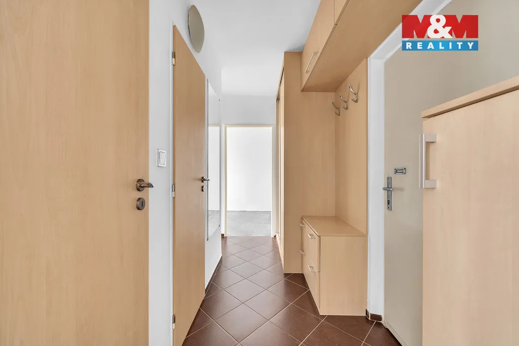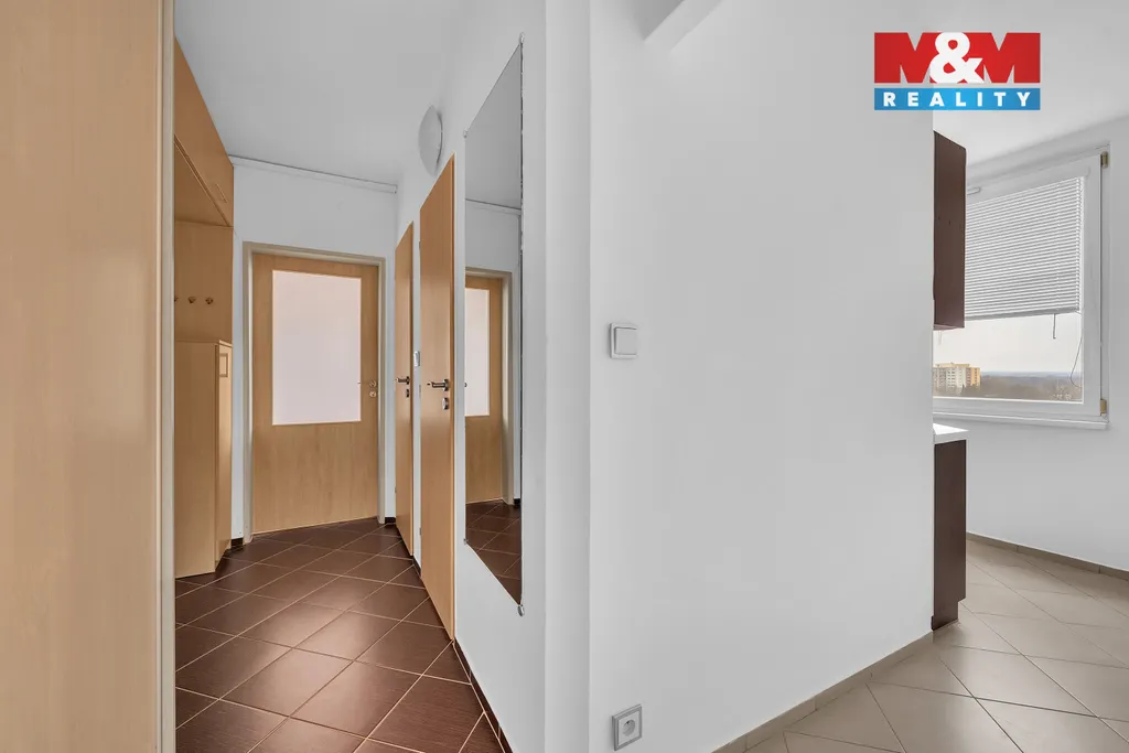 Interiér bytu je zařízen kuchyňskou linkou vybavenou varnou deskou, elektrickým sporákem, digestoří a vestavěnou skříní v předsíni.