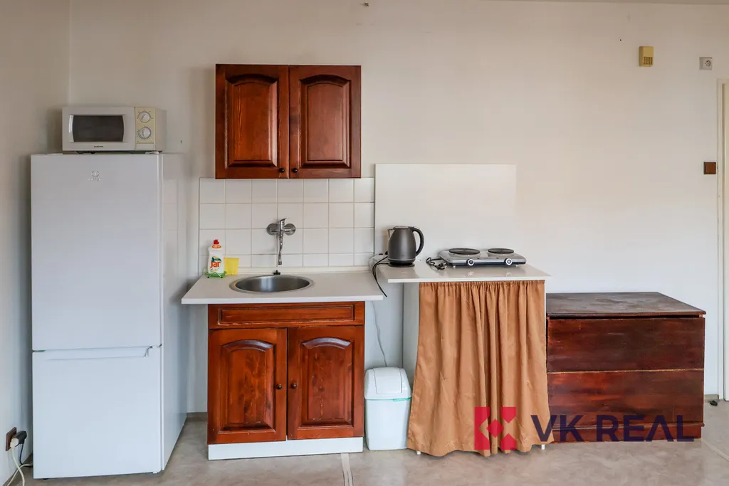 Kuchyňský kout je prakticky vybaven dvouvařičem, mikrovlnnou troubou, rychlovarnou konvicí a základním nádobím. K dispozici je také sušák na prádlo, žehlicí prkno a vysavač, což zajišťuje pohodlné každodenní fungování bez nutnosti dalšího vybavování. Byt je dále vybaven lůžkem a stolem se dvěma židlemi.