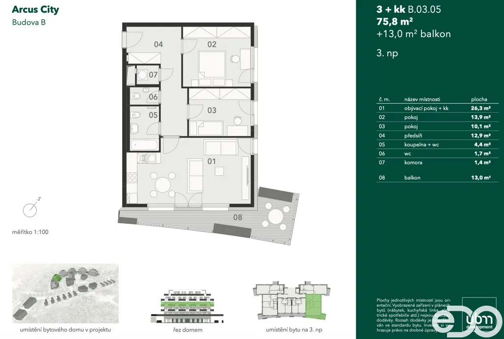 Nabízíme Vám k dlouhodobému pronájmu exkluzivní byt 3+kk 93,1 m² s balkonem a garážovým parkovacím stáním v ulici Hasilova v novém projektu Arcus City na Praze 13.