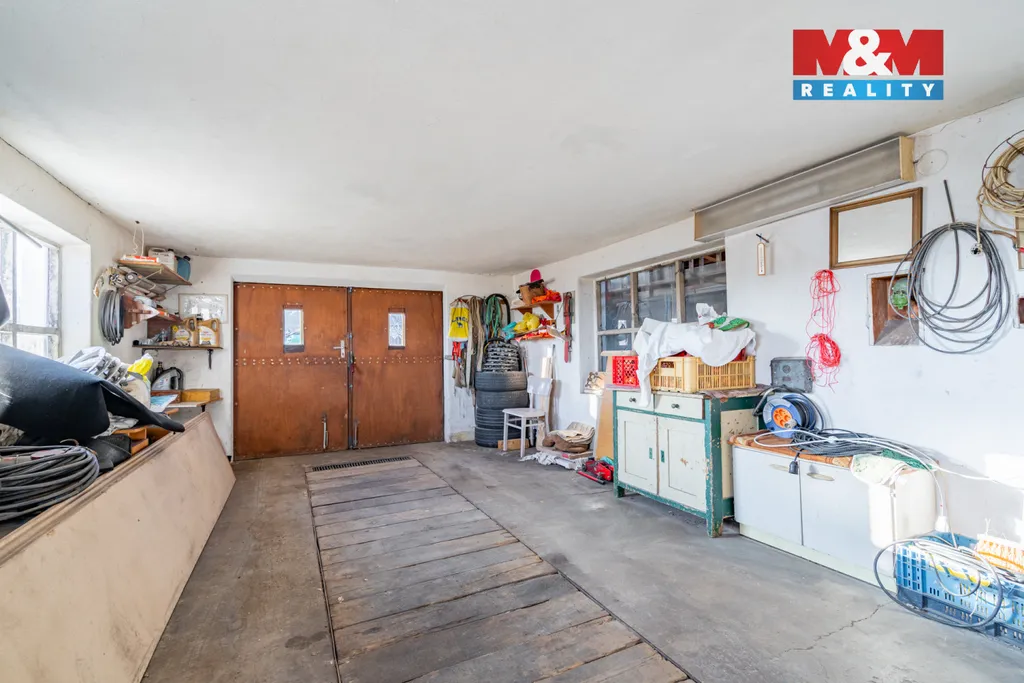 Součástí domu je garáž s montážní jámou pro opravu automobilů, dále dřevěný přístavek (garážové stání).