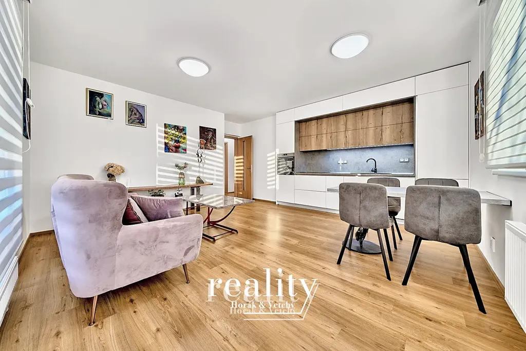 Kuchyň nabízí linku na míru včetně vestavěných elektrospotřebičů (trouba, lednička, myčka, digestoř, sklokeramická deska) a kuchyňský stůl se 4 židlemi. V obývacím pokoji je sedací souprava se stolem, na stěnách jsou dekorační prvky, ve všech oknech je instalován interní stínící systém. Z obývacího pokoje je vstup na velkou terasu se zahradním nábytkem. V dalších místnostech jsou úložné skříně nabízející dostatek prostoru a komfortu včetně manželské a jednolůžkové postele. Byt má samostatnou koupelnu a oddělené WC. Součástí nájmu je sklepní kóje ve vnitrobloku domu. K dispozici je i vnitřní garážové parkovací stání - 2 000 Kč/měsíc.