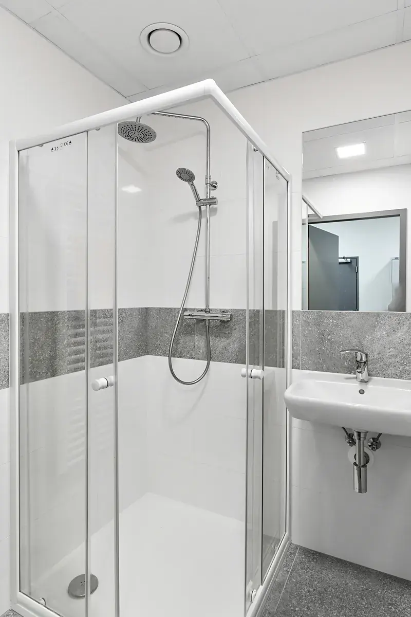 V budově naleznete veškeré zázemí ve formě sdílených zasedacích místností, fitness, kolárny, včetně zázemí se sprchami a šatnami.
