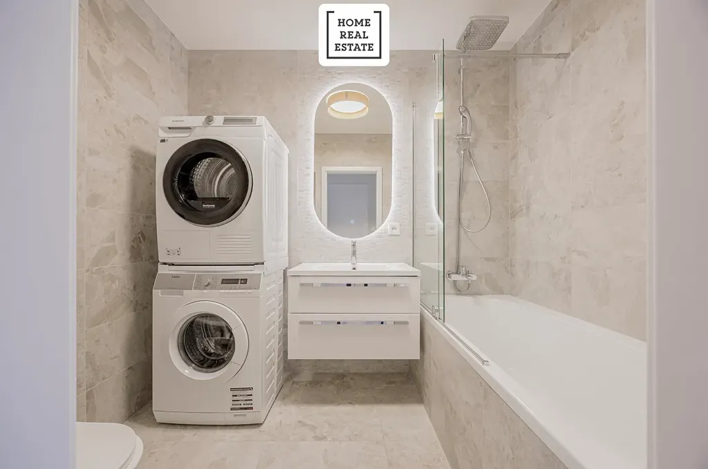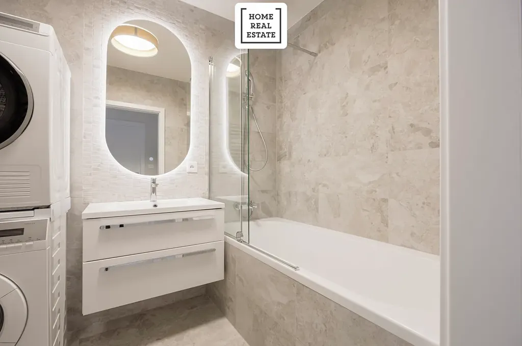 - koupelny, která nabízí krásnou vanu se sprchovým setem, umyvadlo se skříňkou, zrcadlo s LED osvětlením, další WC a pračku se sušičkou,