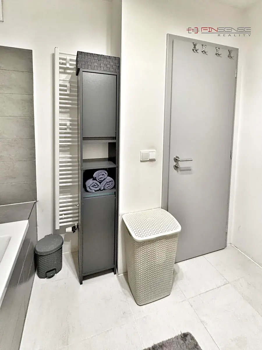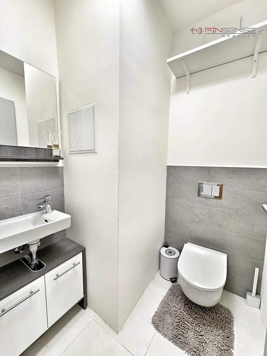 Koupelna je vybavena vanou se zástěnou, umyvadlem a toaletou. Druhá toaleta s umyvadlem je samostatná. Praktickým prvkem je technická místnost s místem pro pračku, sušičku a další úložné prostory.