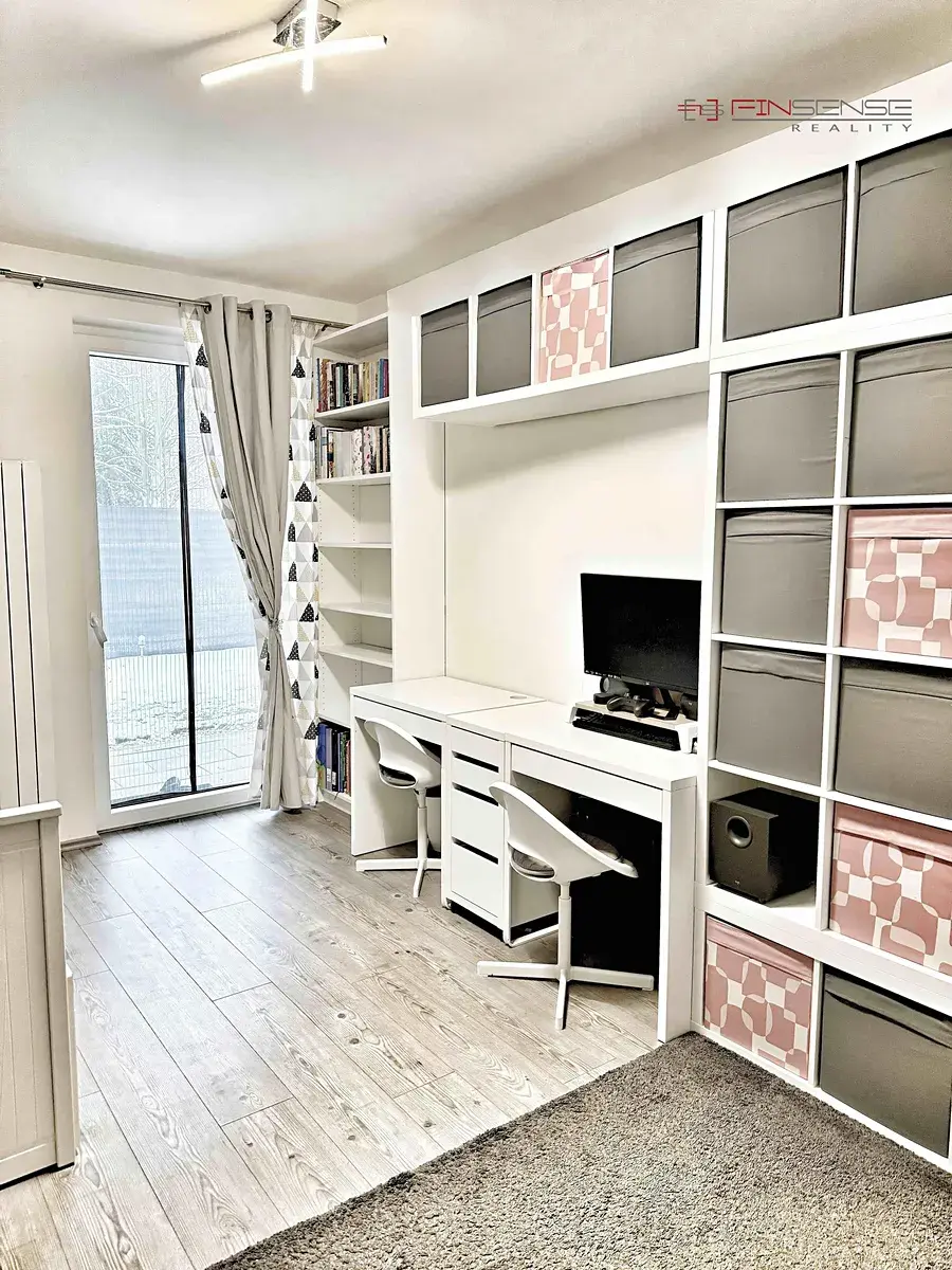Dispozice je řešena účelně a přehledně. Z prostorné vstupní předsíně je samostatný vstup do všech místností. Dva neprůchozí pokoje lze využít jako ložnici, dětský pokoj nebo pracovnu, oba orientované do zahrady. Obývací pokoj s kuchyňským koutem tvoří hlavní obytný prostor bytu a plynule navazuje na terasu. Kuchyňská linka je součástí prodeje, ostatní vybavení je možné ponechat po dohodě.
