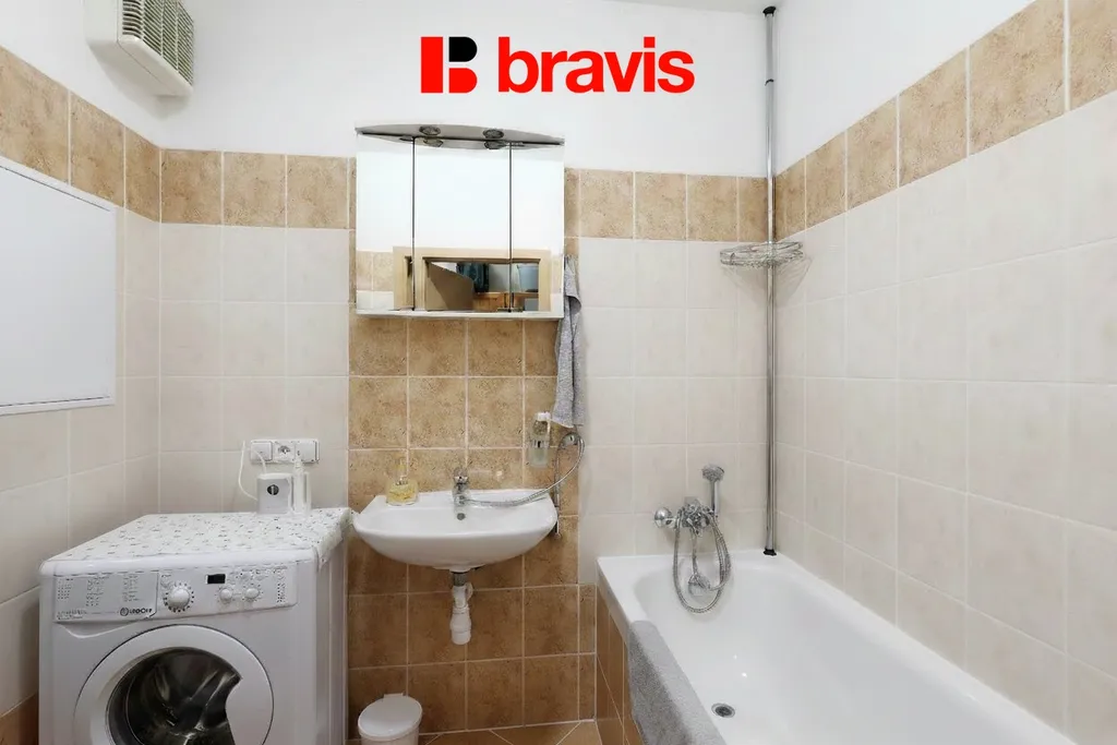 Koupelna je vybavena vanou, toaletou, umyvadlem a je zde také přípojka na pračku či sušičku.