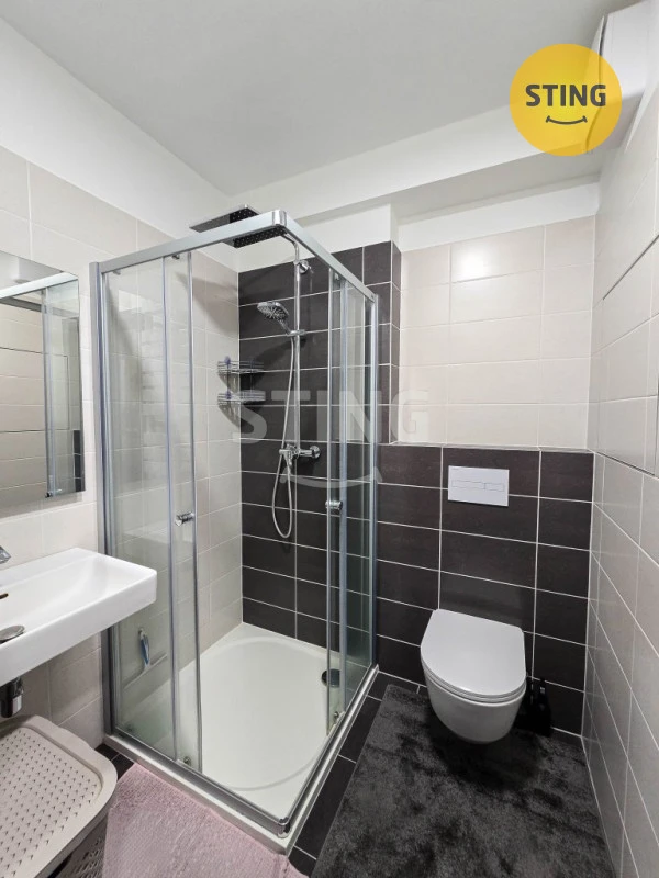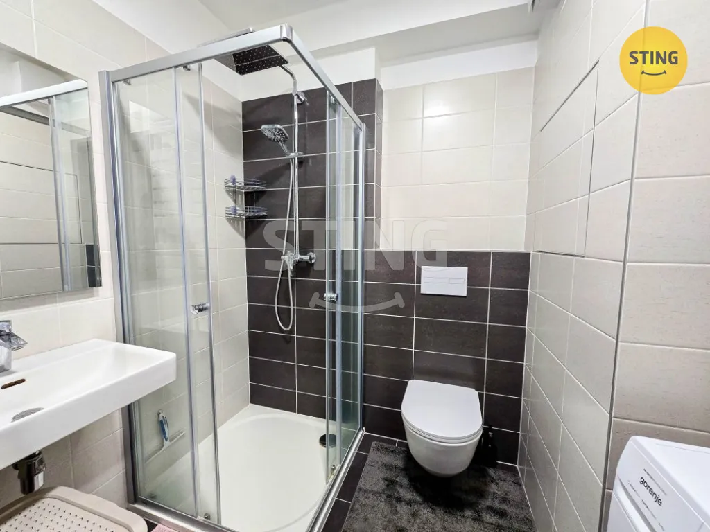 Byt má bezpečnostní vstupní dveře a praktické zádveří s prostorem pro botník, věšák i šatní skříň. Zděná koupelna je provedena v obkladech a dlažbě, vybavena sprchovým koutem, umyvadlem, závěsným WC a místem pro pračku. Obývací pokoj nabízí dostatek prostoru pro denní zónu i spaní a kuchyňský kout s rohovou linkou je vybaven elektrickou varnou deskou, vestavěnou troubou, digestoří a úložnými prostory.