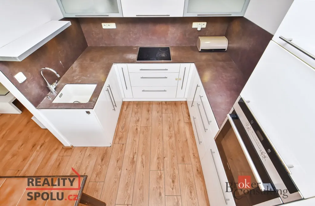 Byt je částečně vybavený – kuchyňská linka, sedací souprava, jídelní stůl, vestavěné skříně. Podlahy jsou plovoucí, byt je ve velmi dobrém stavu.