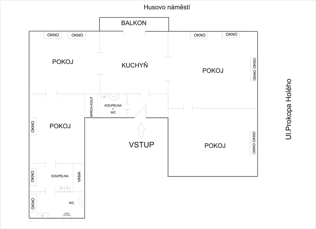 Dispozice: předsíň, samostatná koupelna se sprchovým koutem, umyvadlem a WC, otevřen prostor kuchyně, jídelny a obývacího pokoje, tři samostatné pokoje, velká manželská koupelna s vanou a dvěma umyvadly a samostatným WC. K bytu náleží půdní prostor, přístupný z bytu (plocha půdy není započítána do podlahové plochy bytu).