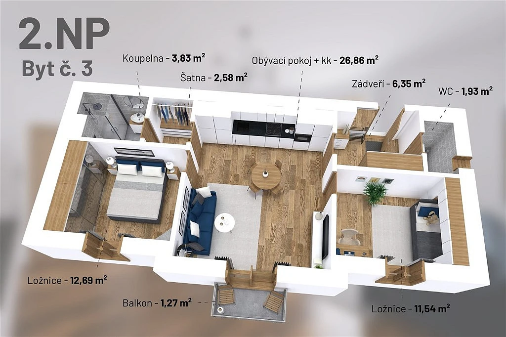 Nabízíme k prodeji moderní byt o dispozici 3+kk a podlahové ploše 64 m² a balkónem (2m²), který splňuje veškeré požadavky na pohodlné bydlení či rekreační využití. Byt je součástí nového developerského projektu a představuje ideální kombinaci funkčnosti, komfortu a atraktivní lokality.