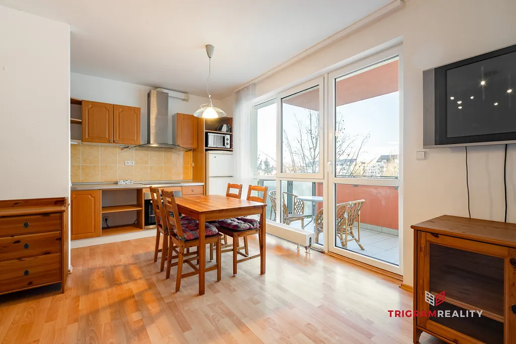 • Obývací pokoj s komodou a televizí nabízí dostatek místa nejen pro sedací soupravu. Součástí je moderní kuchyň vybavená dřezem, elektrickou troubou, indukční deskou, digestoří, ledničkou s mrazákem a mikrovlnkou. V kuchyni je stůl se čtyřmi židlemi. Francouzská okna vedou na balkón s výhledem do zeleně.