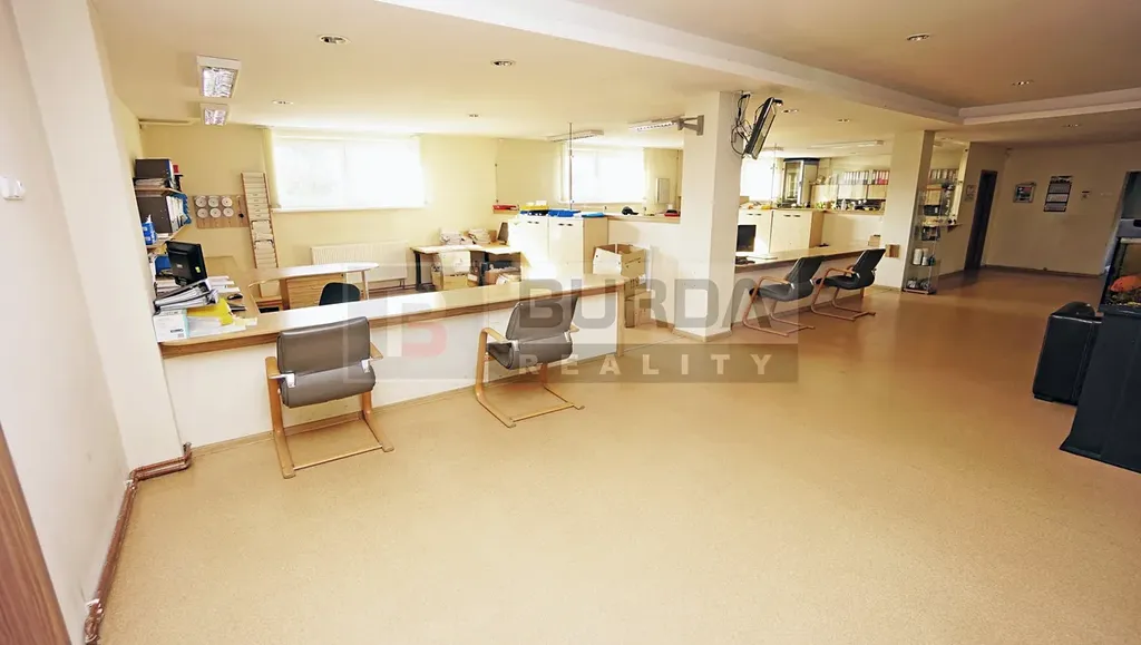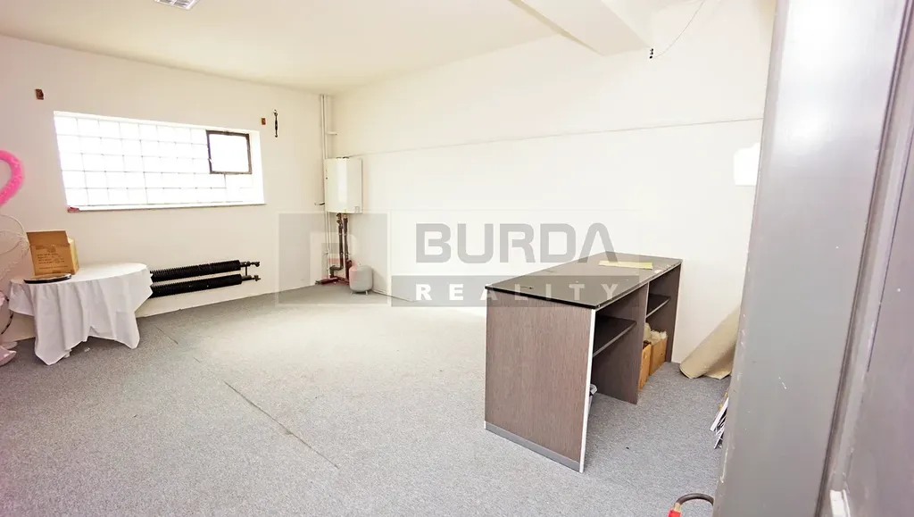 Ve stejném areálu je možné si pronajmout kancelář (jeden modul v otevřené kanceláři) o výměře 4,9 m x 4,9 m = 24 m2 za 7000 Kč měsíčně + 3000 Kč paušál elektřina (na vytápění, světlo, PC a spotřebiče), na přání klienta lze oddělit sádrokartonem. K dispozici je sdílená sociálka (předsíňka, WC, sprcha, umyvadlo). Přístup se sdíleným vstupem.