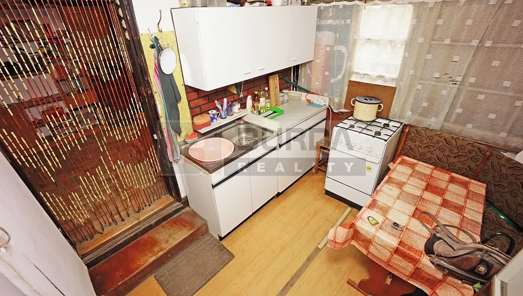 V kuchyňce je dřez, do kterého je přivedena voda ze studny, voda teče po zapnutí elektřiny. Plynový sporák Mora se 4 plotýnkami a s plynovou troubou je napojen na PB bombu, která je umístěna v rohu kuchyně pod krytem.