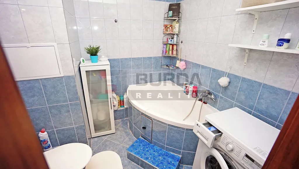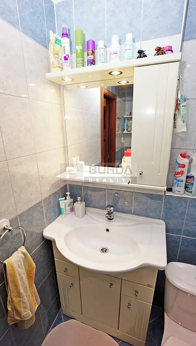 Koupelna je vybavena rohovou vanou, umyvadlem se skříňkou, zrcadlem a poličkami, WC, přípojkami pro pračku, keramickým obkladem a dlažbou. Pračka nezůstane.