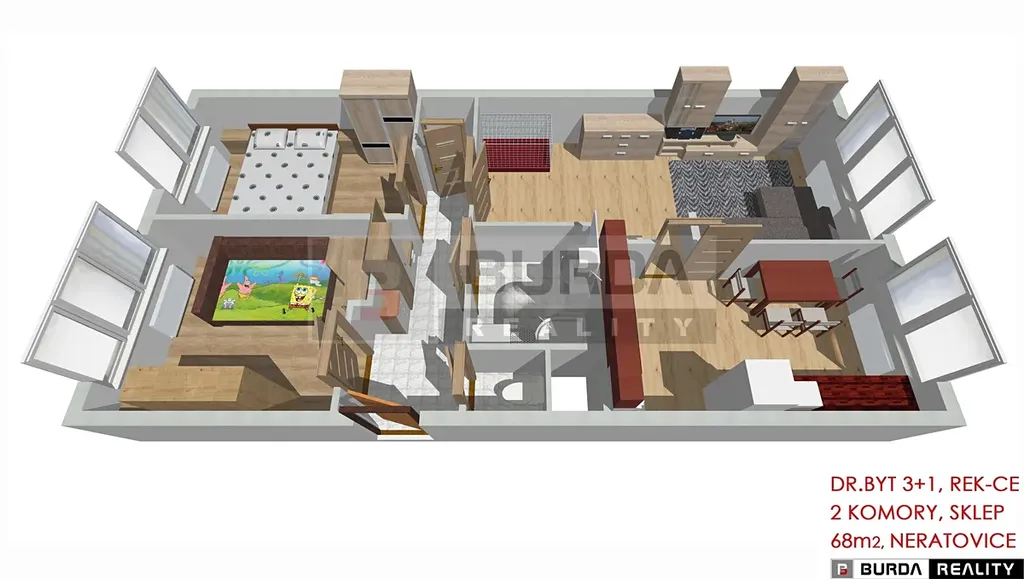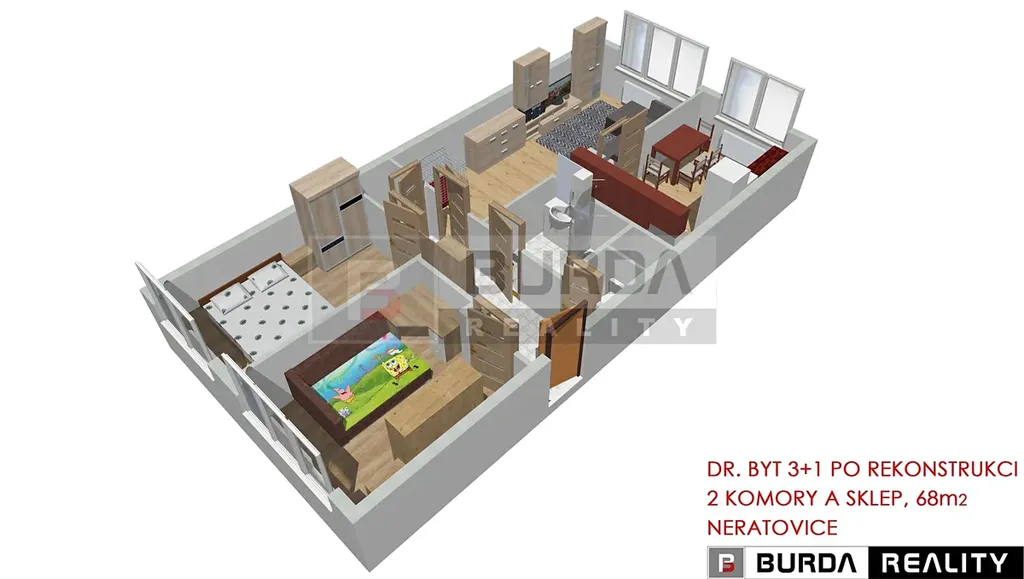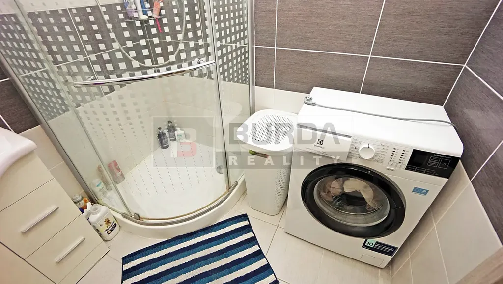 Nábytek v obývacím pokoji lze zanechat, v ložnici lze zanechat postel a velkou šatní skříň, v dětském pokoji může zůstat velká skříň, ostatní nábytek v dětském pokoji nezůstane, rovněž nezůstane pračka, botník a věšáková stěna v chodbě.
