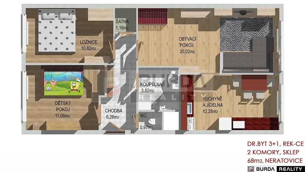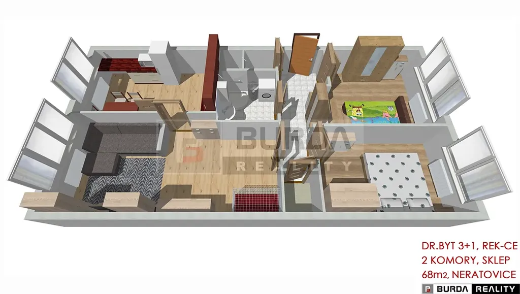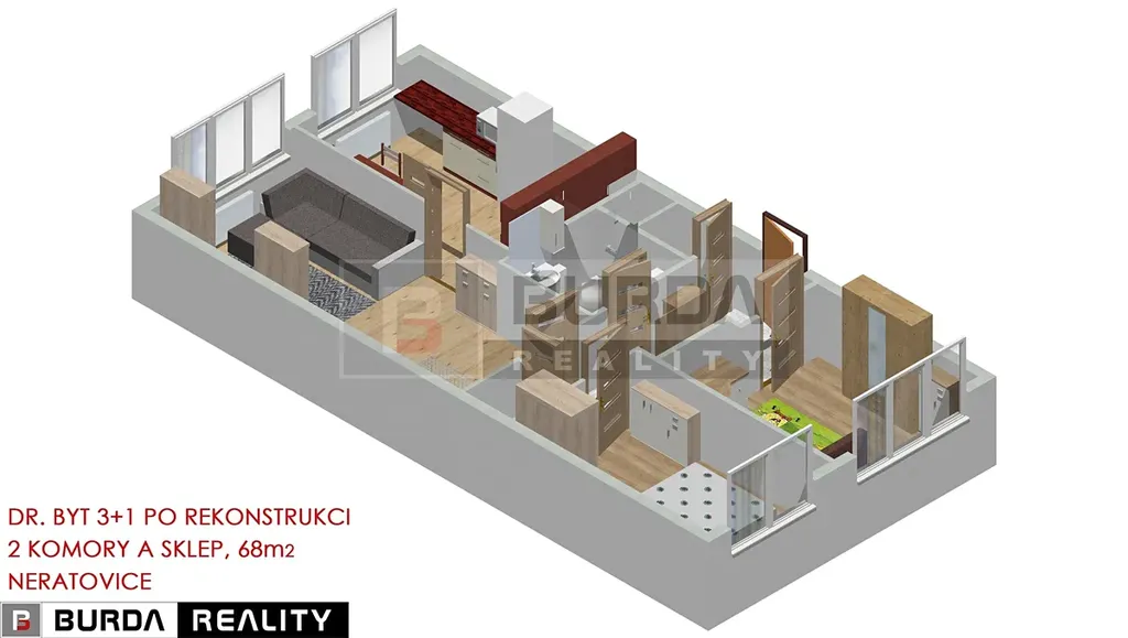 Celková plocha bytu je 68 m2. V bytě je vnitřní komora.