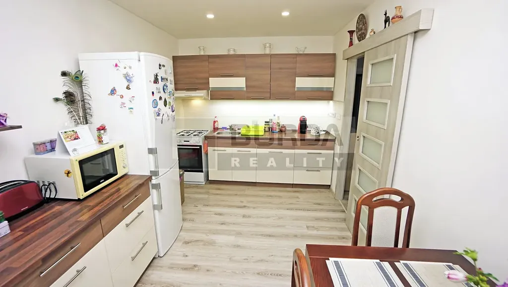 V kuchyni je kuch. linka, kombinovaný sporák Mora, digestoř Mora zaústěná do odtahu v šachtě, volně stojící lednice Whirpool (v případě zájmu může zůstat, stejně tak i stůl se židlemi).