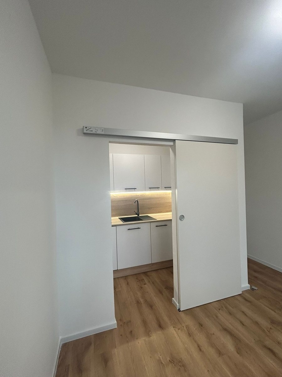 Byt disponuje světlým obývacím prostorem, přičemž kuchyňský kout je prakticky oddělen příčkou s posuvnými dveřmi, což zajišťuje více soukromí i lepší členění prostoru. Kuchyňská linka je vybavena vestavěnými spotřebiči – lednicí s mrazákem, myčkou nádobí, elektrickou varnou deskou, elektrickou troubou, digestoří a dřezem s vodovodní baterií.
