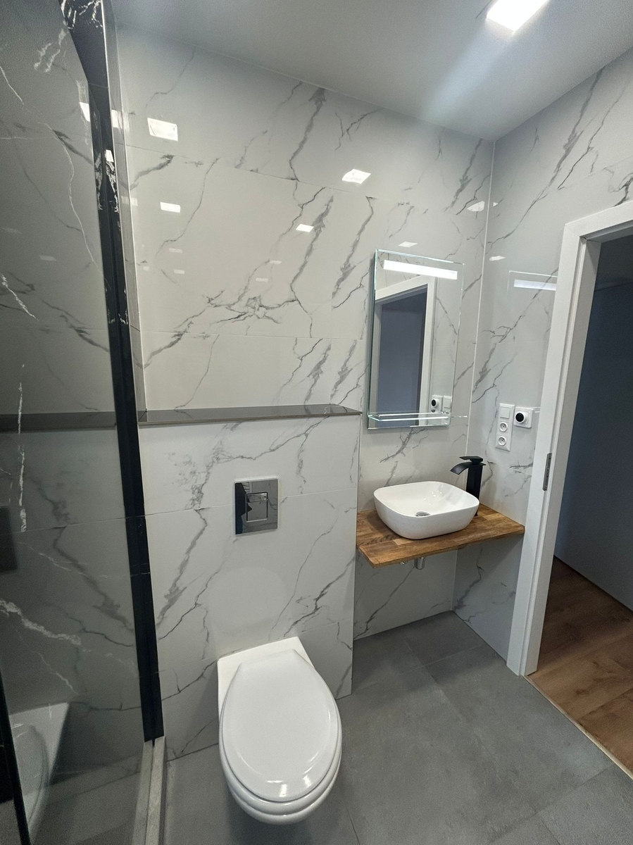 Koupelna je vybavena sprchovým koutem se sprchovou hlavicí, umyvadlem s umyvadlovou skříňkou, toaletou, žebřinovým topením a zrcadlem.