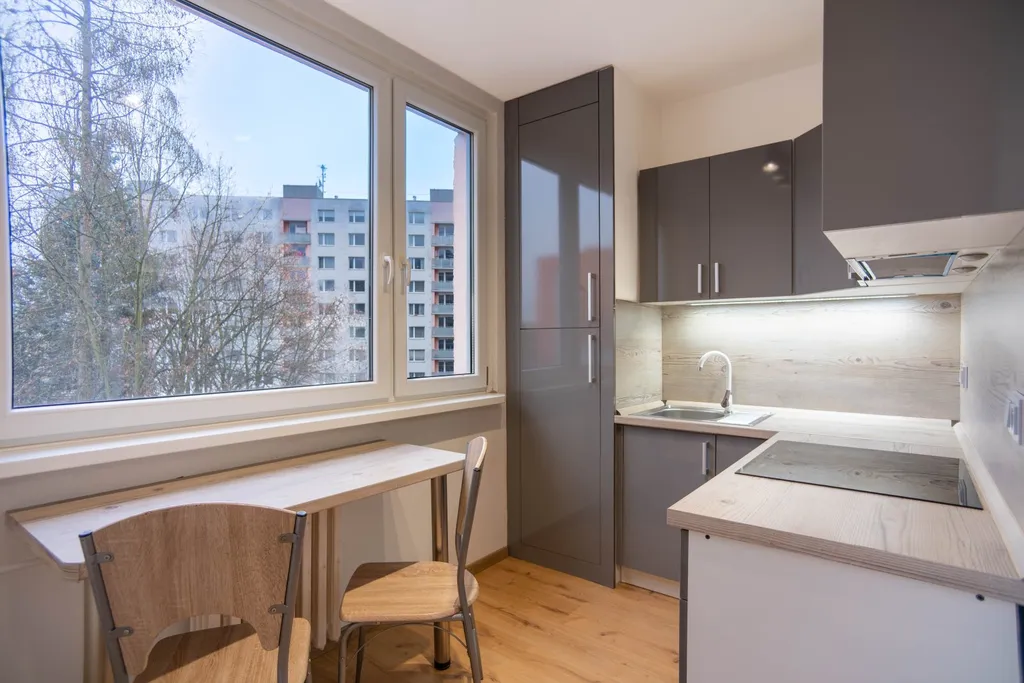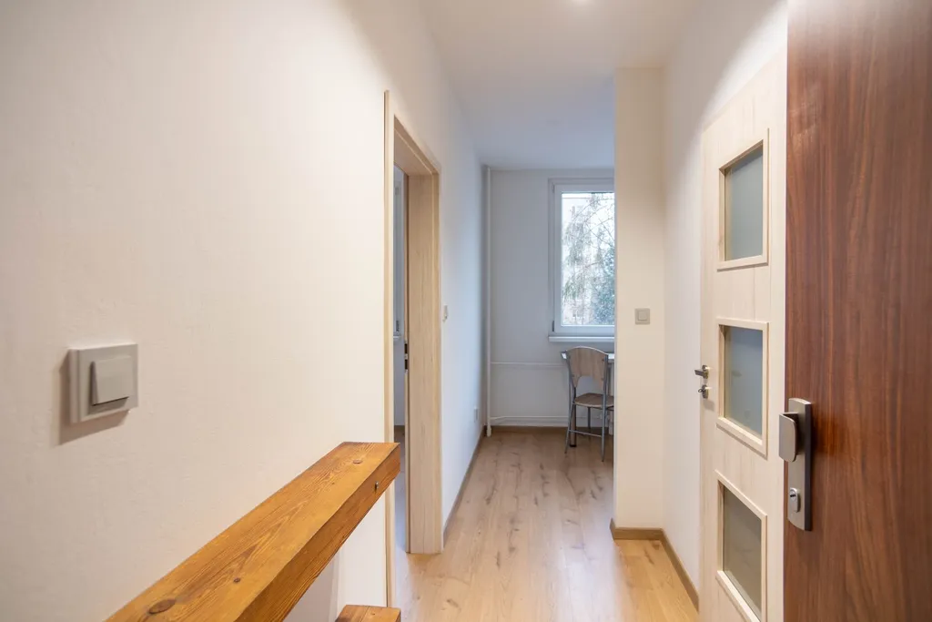 V bytě je nová kuchyňská linka s troubou sklokeramickou deskou (myčka zde není).