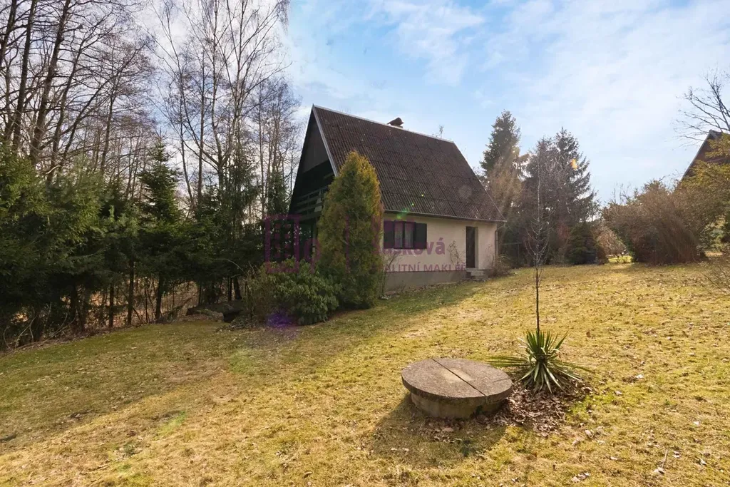 Před chatou se nachází posezení s ohništěm, pozemek je částečně obklopen živým plotem, takže poskytuje jeho uživatelům soukromí.