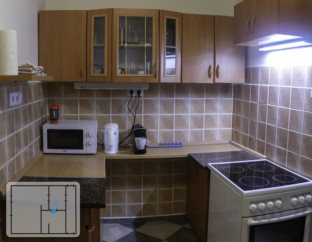 Jedná se o čistý a pečlivě udržovaný byt, částečně zařízeno nábytkem na míru, zajímavá vstupní hala se dvěma okny - přirozené denní světlo.Dispozice bytu: obývací pokoj 20 m² malá oddělená kuchyňka - rohová kuchyňská linka v odstínu buk (2009) je doplněna elektrickým sporákem se sklokeramickou deskou; prostorná koupelna vybavena vanou, přípojka na pračku, WC součástí. V bytě jsou žaluzie, garnyže, stropní svítidla.