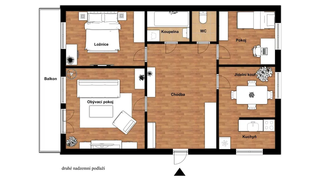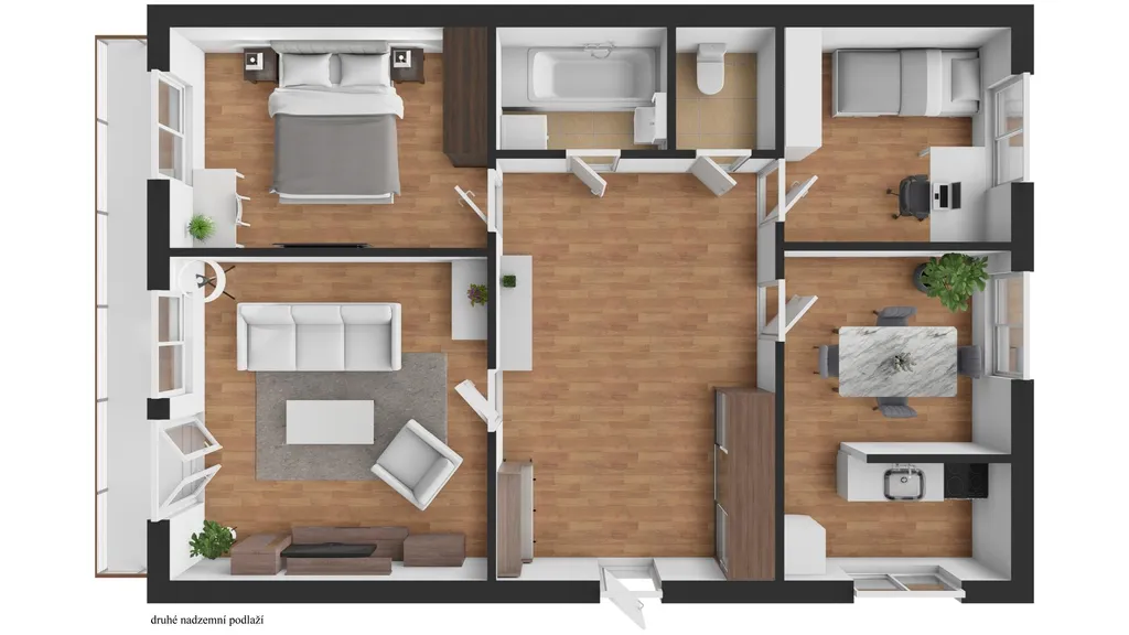 2. patro dispozičně shodná jednotka 3+1 s jídelnou, samostatné pokoje a balkon.