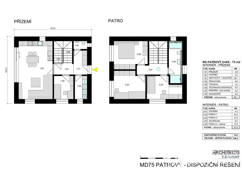 Dům MD75 je navržen jako moderní patrový rodinný dům s důrazem na funkční dispozici, efektivní využití prostoru a komfortní rodinné zázemí. V přízemí o ploše 58,1 m² se nachází předsíň, prostorný obývací pokoj s kuchyňským koutem o velikosti 28,7 m² s přímým vstupem na terasu a zahradu, pracovna, samostatné WC, technická místnost, komora pod schodištěm a schodiště do patra. Horní podlaží o ploše 47,9 m² nabízí tři samostatné pokoje, koupelnu a chodbu zajišťující pohodlné soukromí pro každého člena rodiny. Dispozice je navržena s důrazem na oddělení společenské části v přízemí a klidové zóny v patře.