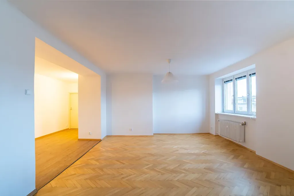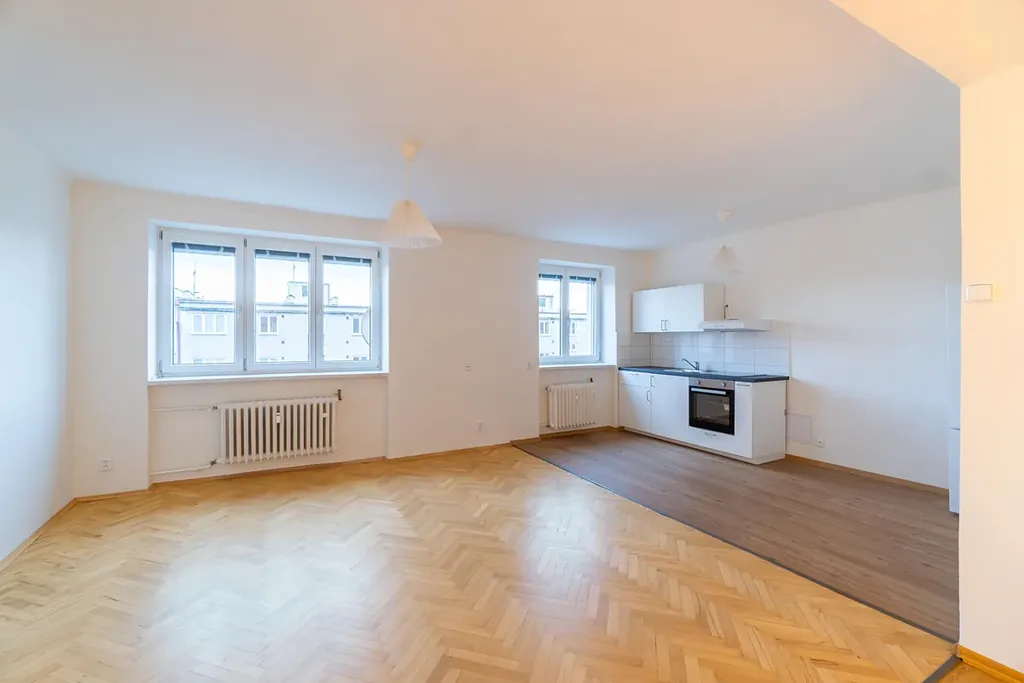 Byt sestává z velice prostorného světlého obývacího pokoje s kuchyňským koutem, který vznikl spojením původní kuchyně a pokoje. Prostor je otevřený do chodby bytu, což mu dodává mimořádnou vzdušnost a ještě umocňuje pocit otevřeného prostoru. Vedle této místnosti je menší pokoj (ložnice) se samostatným vstupem z chodby bytu. Pro inspiraci jsou ve fotogalerii i vizualizace možného zařízení prostoru. V obou místnostech jsou kvalitně renovované parkety. Koupelna i WC jsou rovněž po kompletní kvalitní a vkusné rekonstrukci, v koupelně je připravený přívod na pračku, kterou je rovněž možné umístit vedle kuchyňské linky.