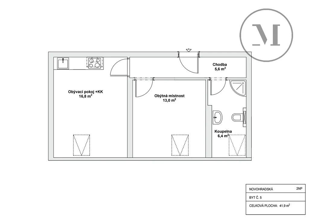 Nabízíme k pronájmu moderní bytovou jednotku č. 5 o dispozici 2+kk a celkové ploše 41,9 m², nacházející se ve 2. nadzemním podlaží (podkrovní byt) kompletně zrekonstruovaného domu na adrese Novohradská 74.