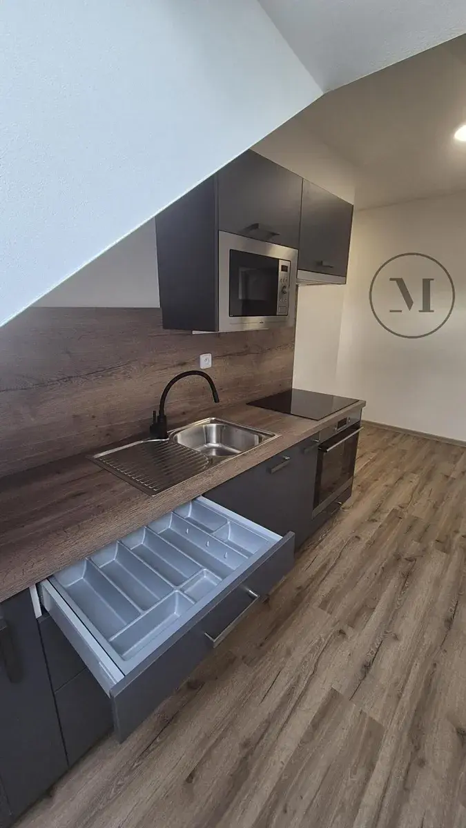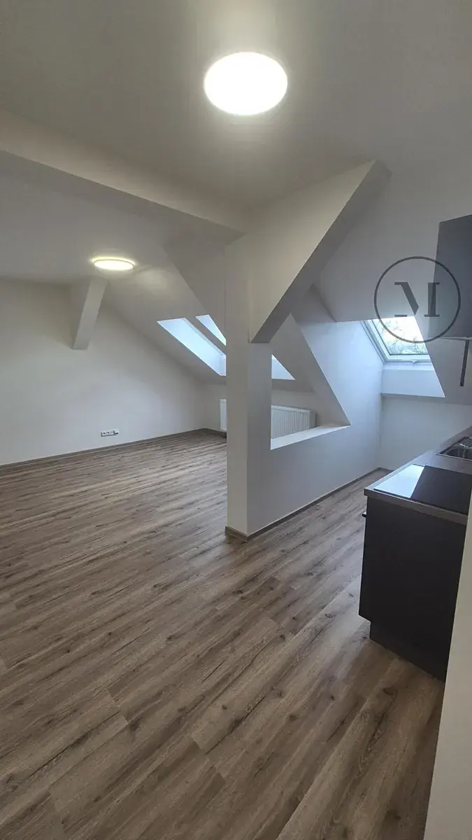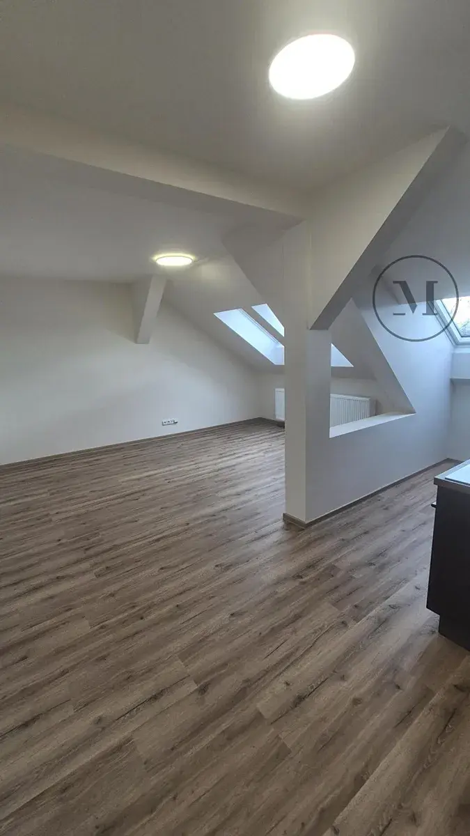 Dominantou bytu je prostorný obývací pokoj s kuchyňským koutem. Moderní koupelna je vybavena sprchovým koutem. Podkrovní charakter bytu vytváří velmi příjemnou atmosféru.