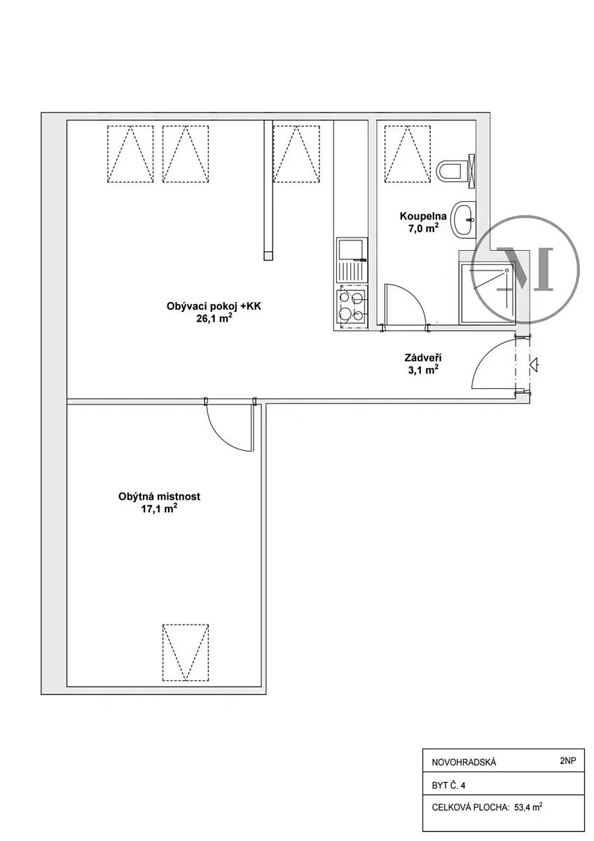 Nabízíme k pronájmu moderní bytovou jednotku č. 4 o dispozici 2+kk a celkové ploše 53,4 m², nacházející se ve 2. nadzemním podlaží (podkrovní byt) kompletně zrekonstruovaného domu na adrese Novohradská 74.
