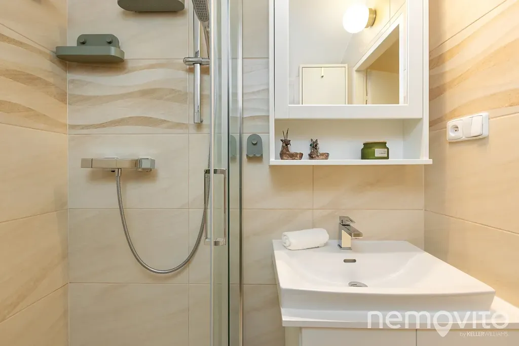 Místnost s kuchyní je aktuálně přepažena vytvořenou příčkou, která oddělila linku od vstupního zádveří. V něm je prostor na botník nebo šatnu. Vstup do obou pokojů je tak od sebe oddělen a nejsou průchozí. Koupelna je vybavena sprchou, WC je samostatně. Vytápění a ohřev vody je řešen elektřinou (bojler, konvektory - náklad 4.000 Kč měsíčně s kompletním provozem domácnosti).