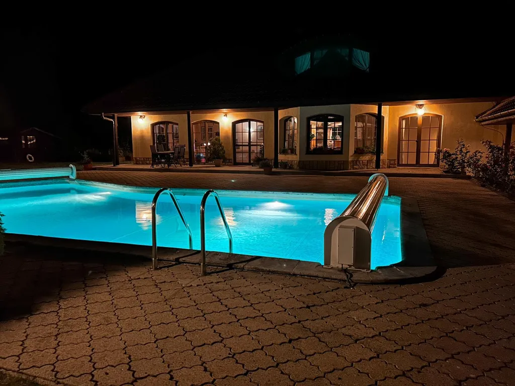 Najdete zde vyhřívaný bazén 12 × 5,5 m s lamelovým zakrytím, automatické zavlažování a zahradní osvětlení.