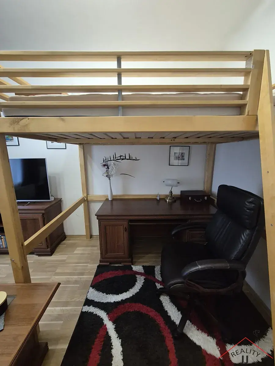 Vstupujeme chodby do druhé – největší místnosti bytu- do obývacího pokoje, který zároveň slouží jako jídelna, ložnice i pracovna. Obývací pokoj je kompletně zařízen novým nábytkem. Je zde praktická patrová postel s prostorem pro pracovní kout s psacím stolem.