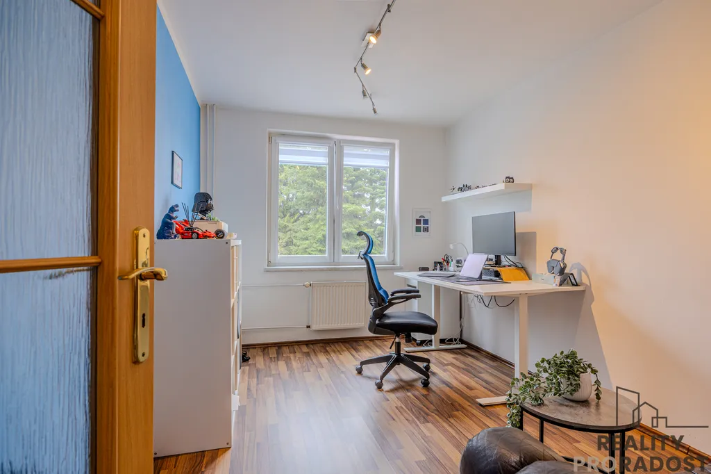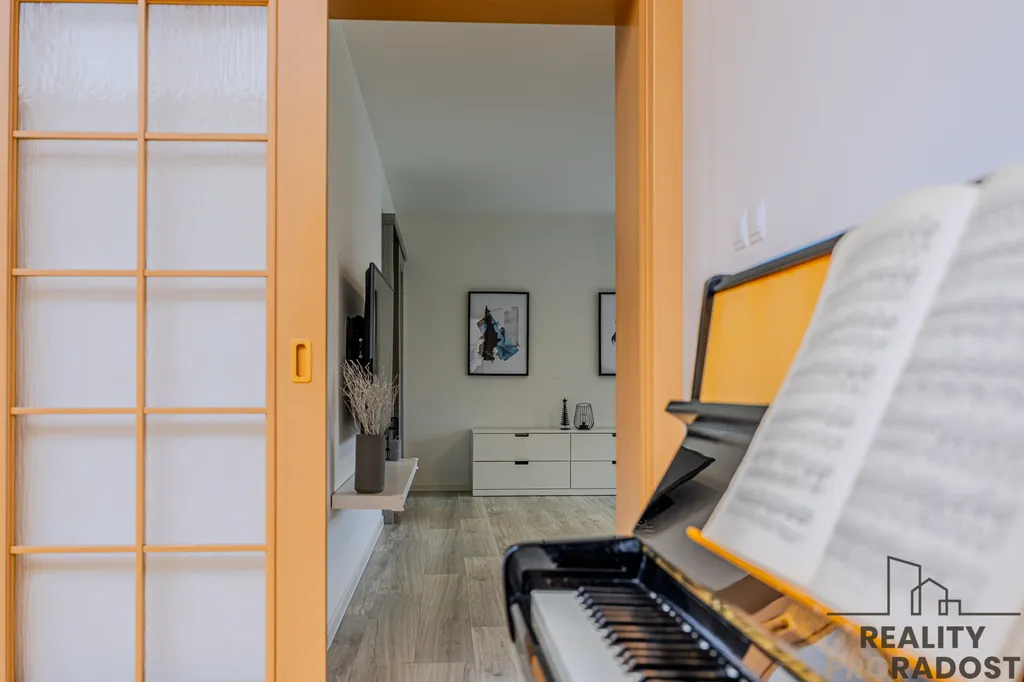 Srdcem domu je obývací pokoj propojený s terasou a zahradou – místo pro letní večery, oslavy i rodinnou pohodu. Obývací pokoj navazuje na jídelnu a ta na moderní kuchyni s indukční varnou deskou, troubou, myčkou a dalším vybavením. V přízemí nechybí ani pracovna a pokoj, který lze využít jako pokoj pro hosty nebo hernu. Koupelna se sprchovým koutem se nachází mezi dvěma pokoji, je zde i komora. Celý prostor působí útulně a propojeně.