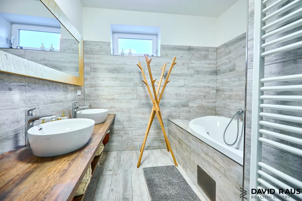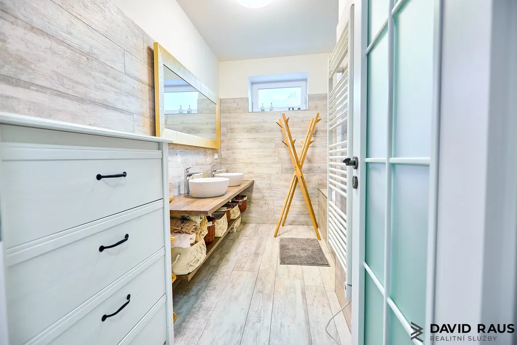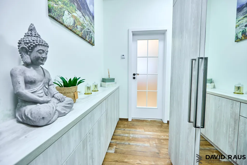 Po vstupu do bytu se ocitnete v předsíni o velikosti 7,40 m², kde jsou vestavěné skříně poskytující dostatek úložného prostoru. Z předsíně se plynule dostanete do všech dalších částí bytu. Nejprve míjíte samostatné WC o výměře 1,50 m² a následně vstupujete do koupelny o velikosti 7,20 m². Koupelna je vybavena vanou a dvěma samostatnými umyvadly umístěnými na desce vyrobené na míru, pod kterou se nachází praktický úložný prostor. Velkou výhodou je také okno umístěné ve výšce přibližně 1,80 m, které zajišťuje přirozené světlo i možnost větrání.