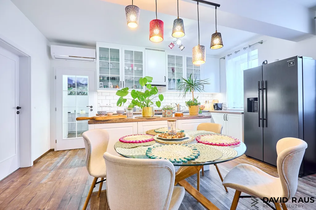 Prosklenými dveřmi vstoupíte do hlavního obytného prostoru, který tvoří obývací pokoj s kuchyňským koutem o výměře 32,6 m². Kuchyňská část je přirozeně oddělena designovým pultem navazujícím na kuchyňskou linku, což vytváří funkční a přehledné uspořádání prostoru. Součástí kuchyně je také samostatná americká lednice s vestavěným výrobníkem ledu.