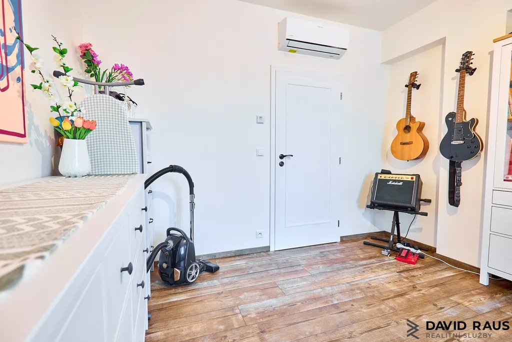 V obývacím pokoji i v obou pokojích je instalována klimatizace, která zajišťuje komfort během letních měsíců. Vytápění je řešeno podlahově. Byt je vymalován bílou barvou a ve všech obytných místnostech je položena vinylová podlaha v dekoru dřeva, která působí nadčasově a příjemně.