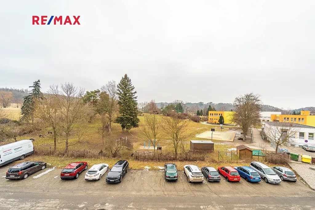 Výhled z balkonu je na jižní stranu do zeleně na dětské hřiště.